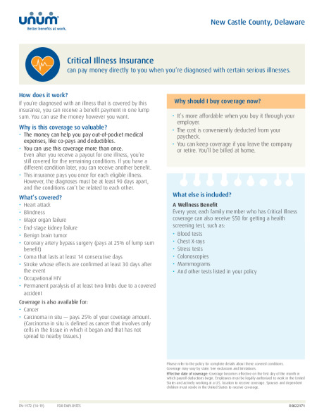 The signs pointing to a critical illness are not always clear and may not be preventable, but our coverage can help offer financial protection in the event you are diagnosed. Unum Life Insurance Company of America group voluntary critical illness coverage provides a lump-sum cash benefit to help you cover the out-of-pocket expenses associated with a critical illness.