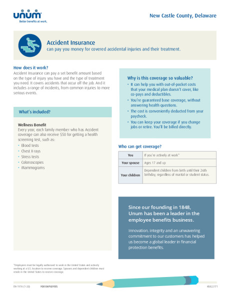 Accidents can happen at any moment throughout the day, whether at work or at play. Most major medical insurance plans only pay a portion of the bills. Our policy can help pick up where other insurance leaves off and provide cash to cover the expenses. Our accident coverage helps offer peace of mind when an accidental injury occurs.