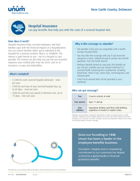 Hospital Insurance can pay you a benefit when you are admitted to the hospital for a covered injury or illness. It can help with out of pocket expenses medical insurance may not cover such as co-pays and deductibles. You decide how to spend the money. Coverage is also available for your spouse and children.