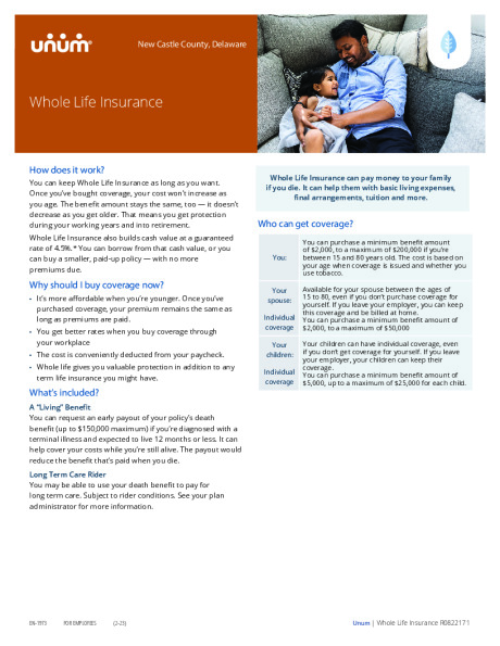 A “Living” Benefit you can request an early payout of your policy’s death benefit (up to $150,000 maximum) if you’re diagnosed with a terminal illness and expected to live 12 months or less. It can help cover your costs while you’re still alive. The payout would reduce the benefit that’s paid when you die. Long Term Care Rider You may be able to use your death benefit to pay for long term care. Subject to rider conditions. Contact UNUM on 855-938-1329 or www.unum.com for more information.